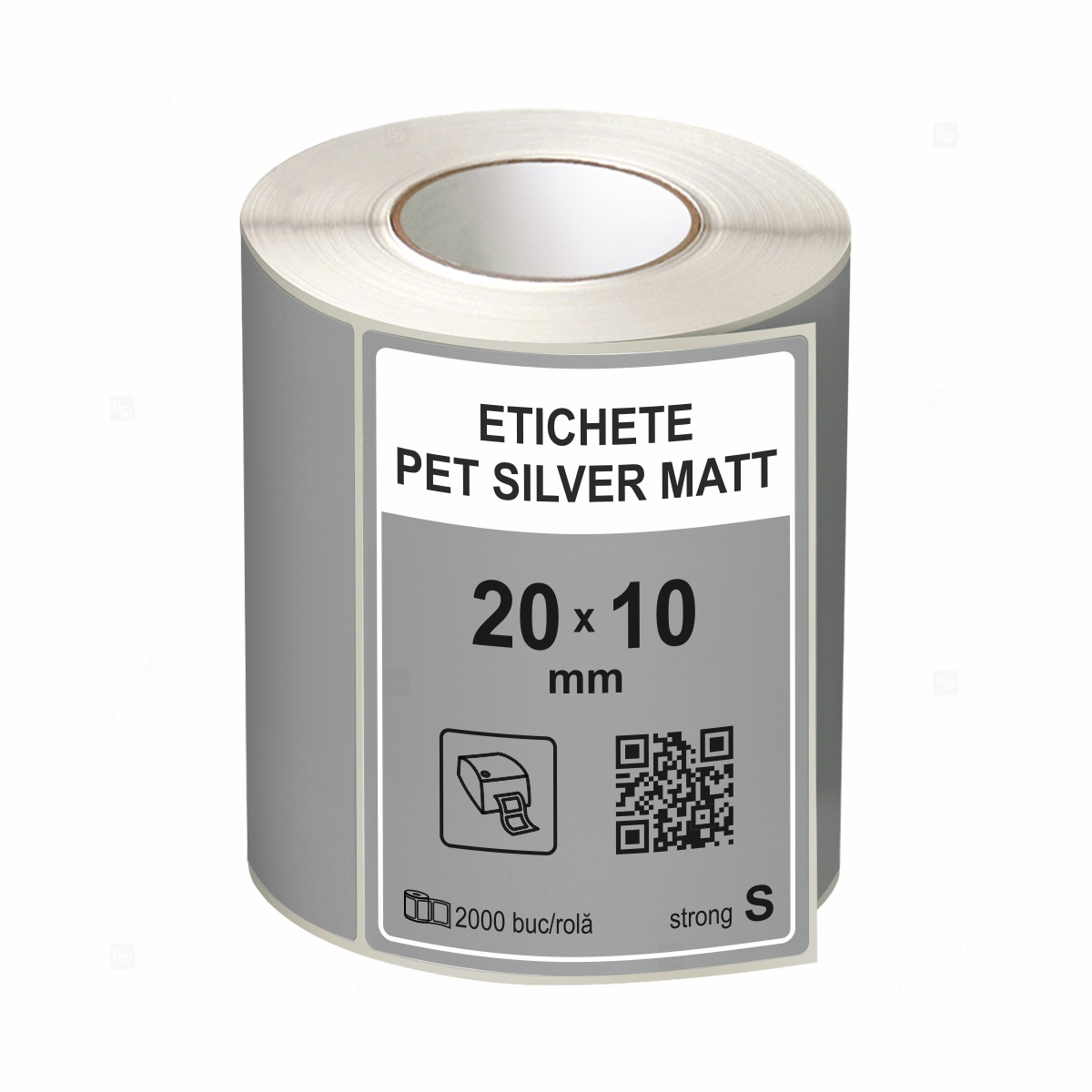 Etichete ultra-rezistente din PET Silver Matt (20x10mm) cu adeziv Strong, ideale pentru mediul industrial și inventariere. Necesită imprimare cu ribon pentru o durabilitate maximă a textului.