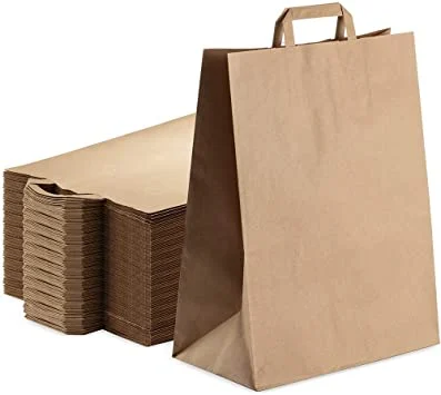 Pungi din hartie cu dimensiunea 22+10 x 28 cm, cu maner de tip banda, maro – potrivite pentru cumparaturi, cadouri sau livrari de alimente.